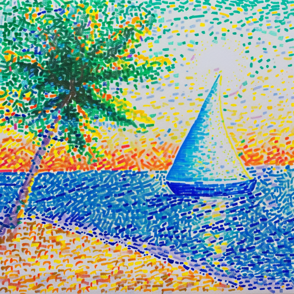 The colouring technique of pointillism involves creating images using a multitude of small dots of colour juxtaposed against each other. Rather than mixing colours on the palette or surface, artists apply separate dots of different hues which, when viewed from a distance, combine optically to form nuances and detailed images. This method produces unique effects of light and texture, while adding a vibrant and dynamic dimension to the drawing. Pointillism requires great patience and meticulous precision, as each dot must be carefully placed to contribute to the harmonious whole of the work. Used mainly in painting, this technique can also be applied with pencils, felt-tips or pens to achieve equally impressive results. Pointillism is famous for its ability to create complex and captivating visual compositions, where each dot of colour plays a crucial role in the overall perception of the image.